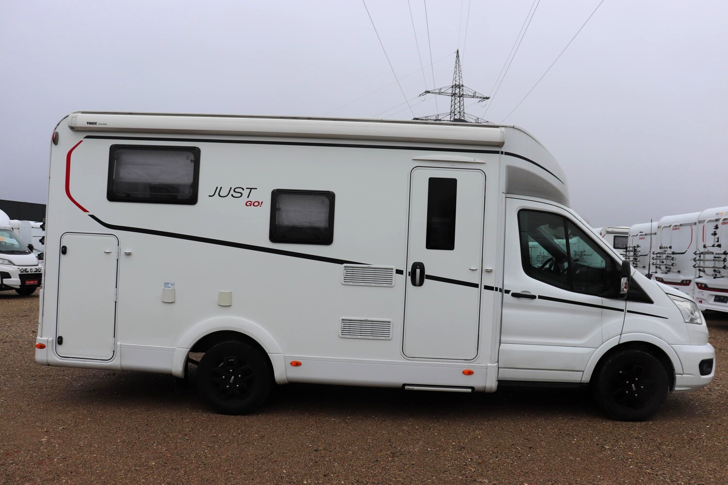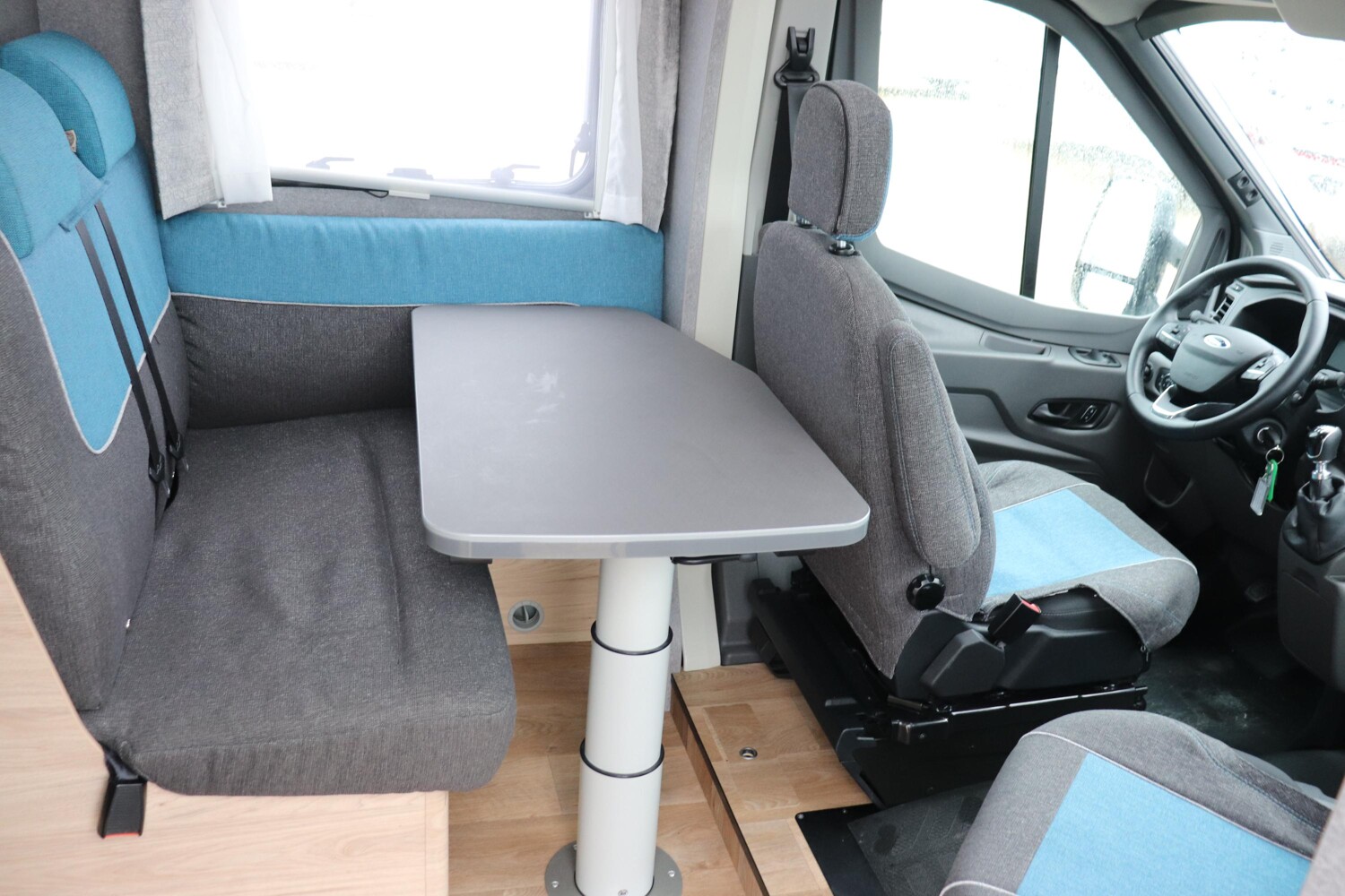 - Comfort Paket T 6615 EB (Klimaanlage inkl. Staub- und Pollenfilter, Handschuhfach mit Deckel, abschließbar, Innenraumpaket Trend-Line, Seitenschutzleisten in Wagenfarbe lackiert, Stoßfänger vorn in Wagenfarbe lackiert, Nebelscheinwerfer, Scheinwerfer mit statischem Abbiegelicht, Außenspiegel elektrisch einstellbar und beheizbar, Alufelge Ford 16 Zoll, schwarz, Frontscheibe, beheizbar, Scheibenwischer mit Regensensor, Notbrems-Assistent, aktiv (kamerabasiert), Fahrspur-Assistent mit Müdigkeitswarner, Fernlicht-Assistent und Fahrspurhalte-Assistent, Scheinwerfer-Assistent mit Tag/Nacht-Sensor, Wohnraumtür mit Fenster inkl. Verdunkelung und Zentralverriegelung (inkl. Fahrerhaustüre), Panorama-Dachhaube 70 x 50 cm im Wohnraum, Wohnwelt Salerno inkl. Fahrer- und Beifahrer-Sitzbezug, Light Moments: Indirekte Wandflächen-Ambientebeleuchtung, Light Moments: Indirekte Ambientebeleuchtung über den Dachstauschränken, Verdunklungsjalousien im Fahrerhaus, Ausstellfenster in der T-Haube, Gemütliche L-Sitzgruppe mit freistehendem, absenkbarem Tischfuß und 2 integrierte 3-Punkt-Gurte, Bettumbau Einzelbetten zu Doppelbett, Stauraum-Türe links)