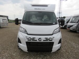 - Serienausstattung Glücksmobil (Zenec Navi inkl. DAB+ und Truck Navigation, Rückfahrkamera (einfach, Rahmenfenster inkl. Küchenrückwand, Cassettenmarkise 4,0m manuell, 16 Zoll Alufelgen, Aufbautüre mit Fenster und Zentralverriegelung, Verdunkelungsjalousien im Fahrerhaus, Panorama-Dachhaube 70x50cm im Wohnraum, L-Sitzgruppe, Garagenklappe links, Indirekte Beleuchtung, Indirekte Gardinen-Beleuchtung o. Dimmung, CP Plus, Duschrost, Vorb. Solaranlage, Vorb. Dach-Klimaanlage, Ausstellfenster in der T-Haube, Küchenrückwand beleuchtet, Wohnwelt Heron, GT Abklebung, Bettenumbau EB zu DB, Glücksmobil Beklebung)