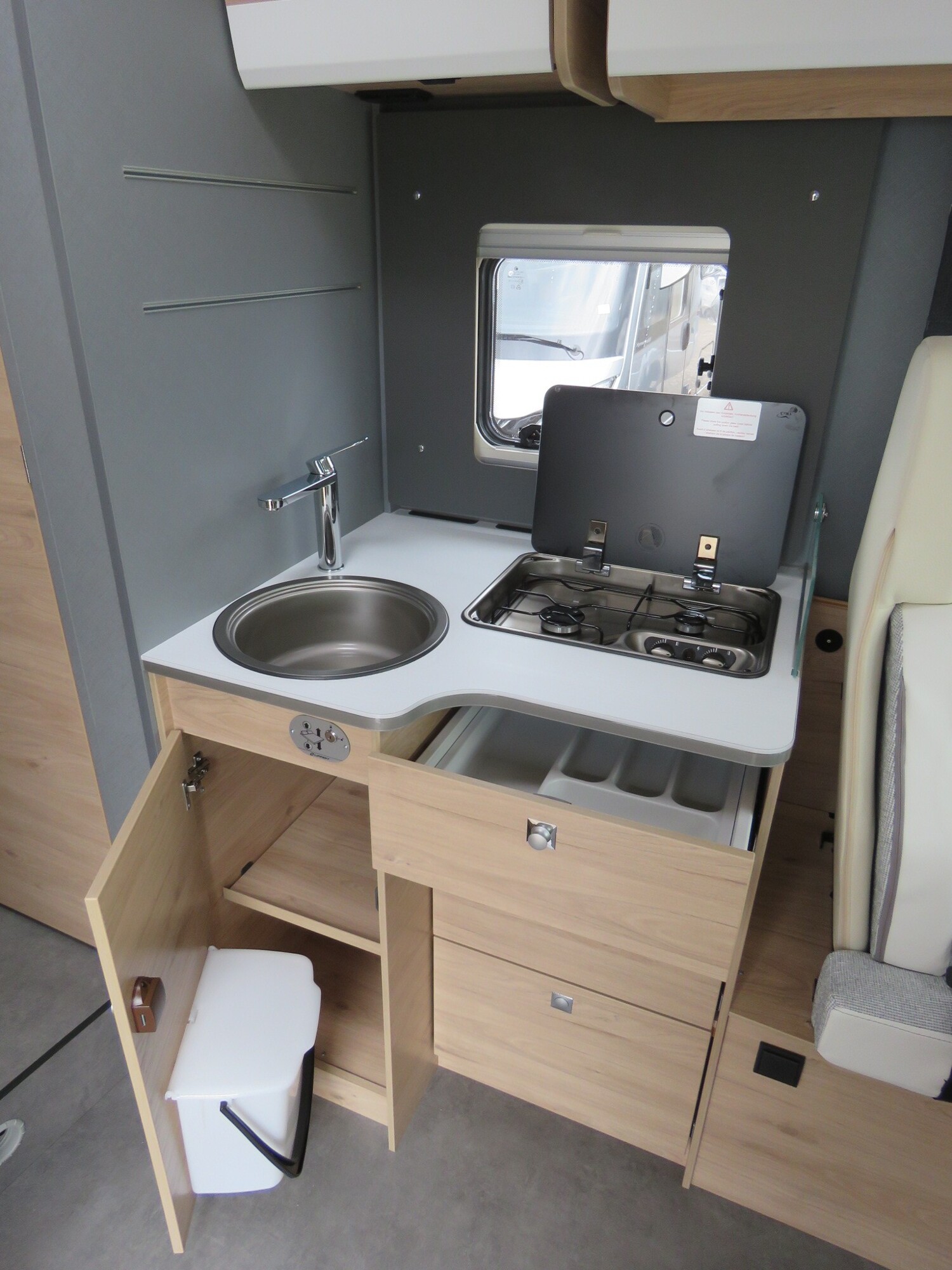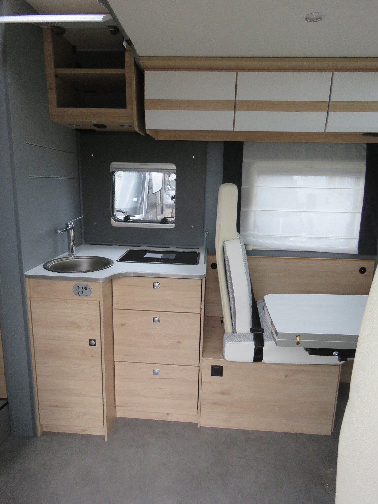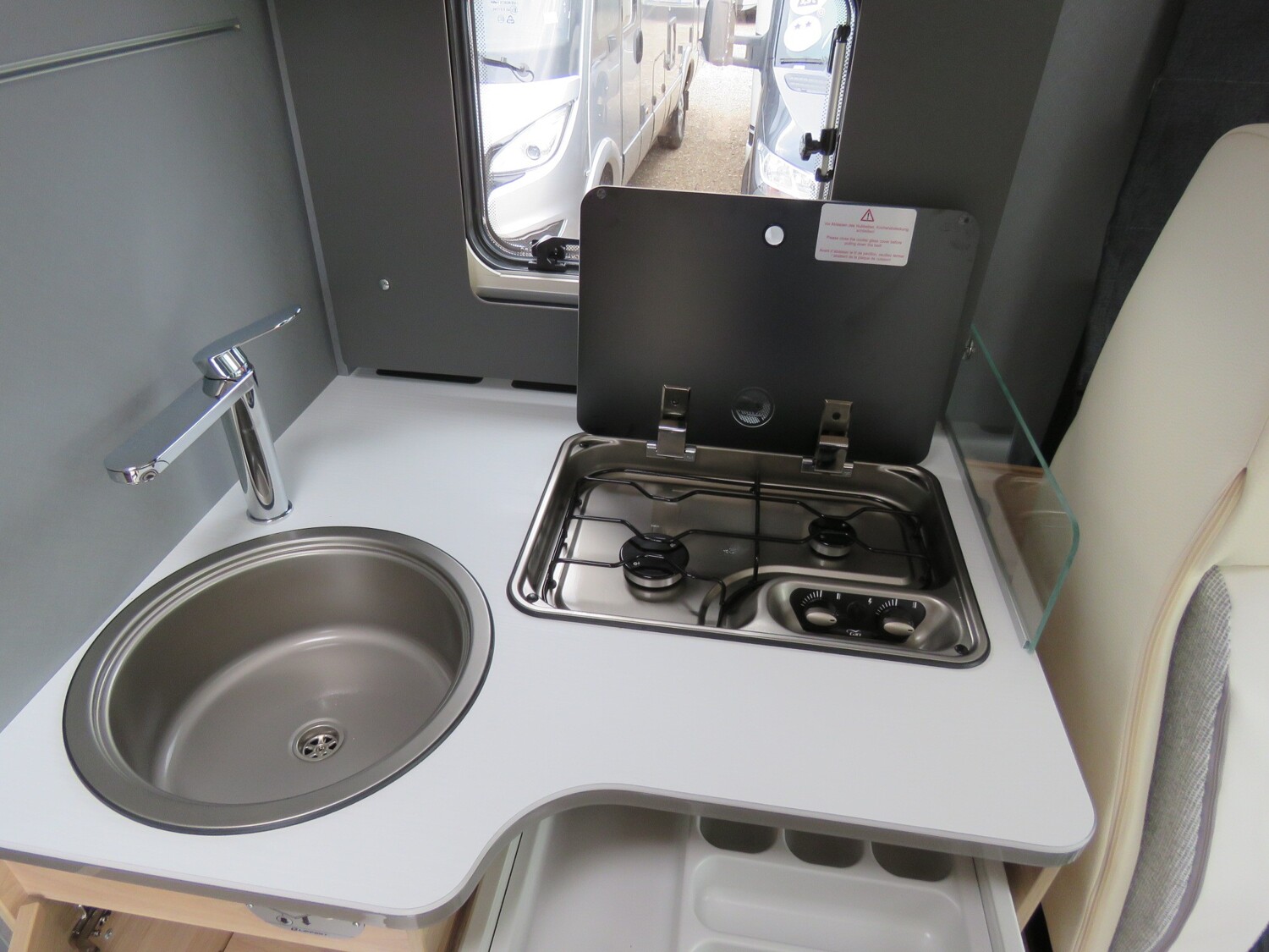 - Serienausstattung Glücksmobil (Zenec Navi inkl. DAB+ und Truck Navigation, Rückfahrkamera (einfach, Rahmenfenster inkl. Küchenrückwand, Cassettenmarkise 4,0m manuell, 16 Zoll Alufelgen, Aufbautüre mit Fenster und Zentralverriegelung, Verdunkelungsjalousien im Fahrerhaus, Panorama-Dachhaube 70x50cm im Wohnraum, L-Sitzgruppe, Garagenklappe links, Indirekte Beleuchtung, Indirekte Gardinen-Beleuchtung o. Dimmung, CP Plus, Duschrost, Vorb. Solaranlage, Vorb. Dach-Klimaanlage, Ausstellfenster in der T-Haube, Küchenrückwand beleuchtet, Wohnwelt Heron, GT Abklebung, Bettenumbau EB zu DB, Glücksmobil Beklebung)