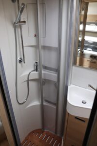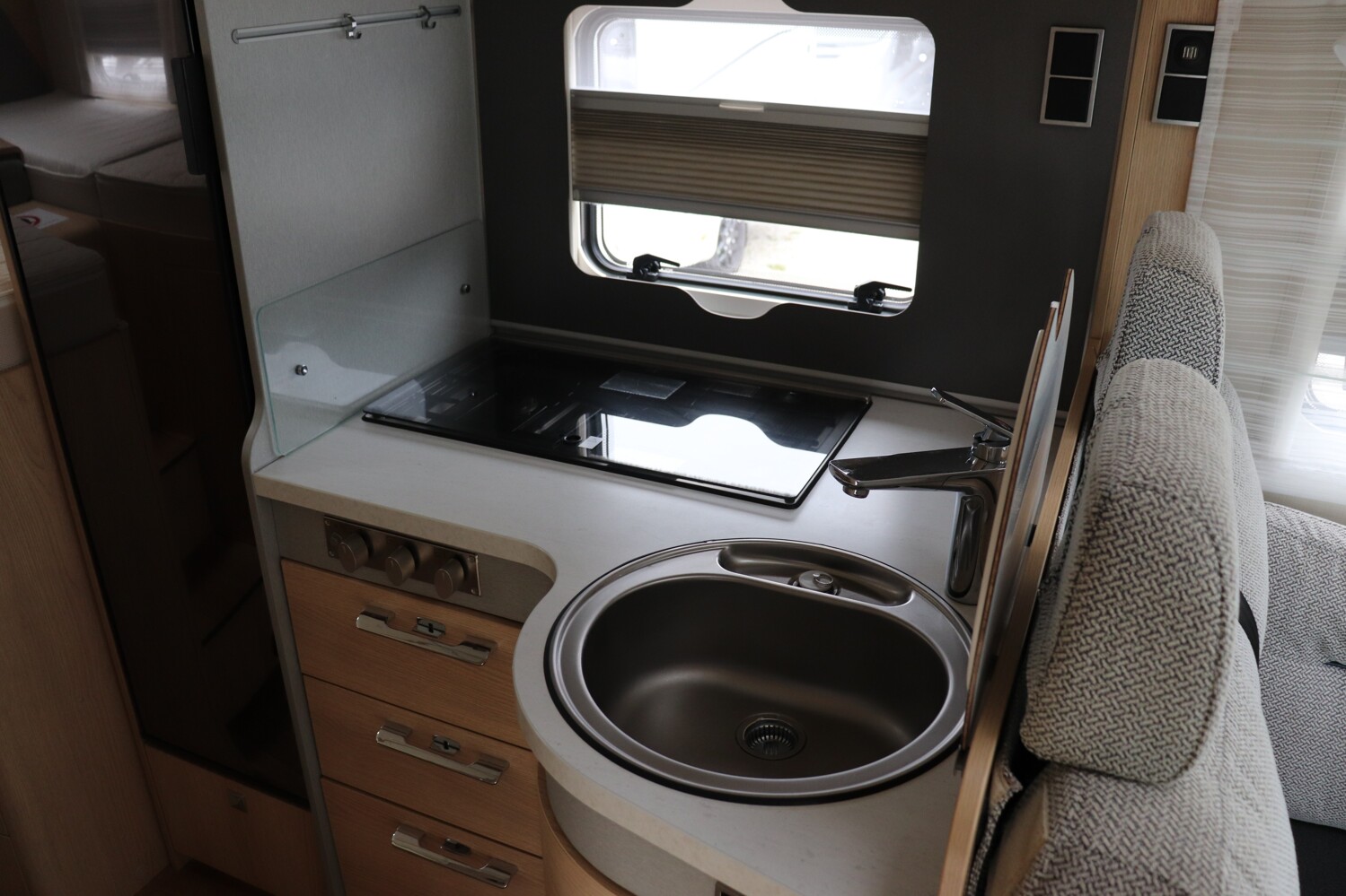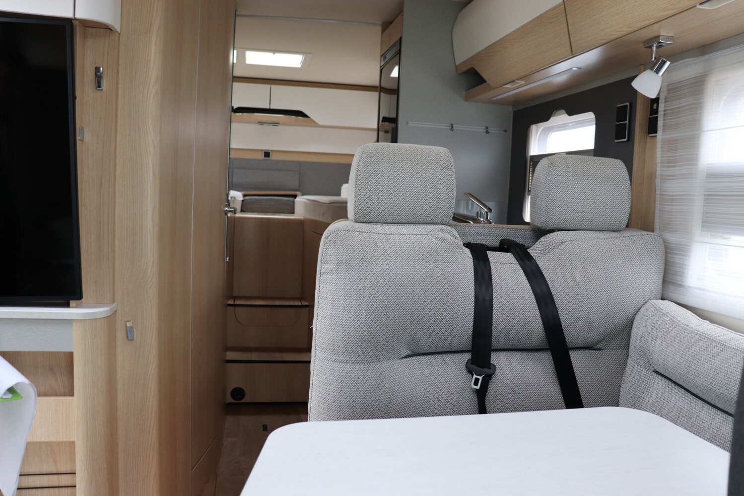 • Komfort Plus-Paket 5 (Fliegenschutzrollo an der Eingangstür, Panoramadach über Fahrerhaus, manuell ausstellbar, Fenster mit Verdunkelungsrollo und integriertem Mülleimer in Eingangstür, Faltverdunkelung für Fahrerhaus, Schublade und Einlegewanne als Stauraum in der Sitzgruppe)