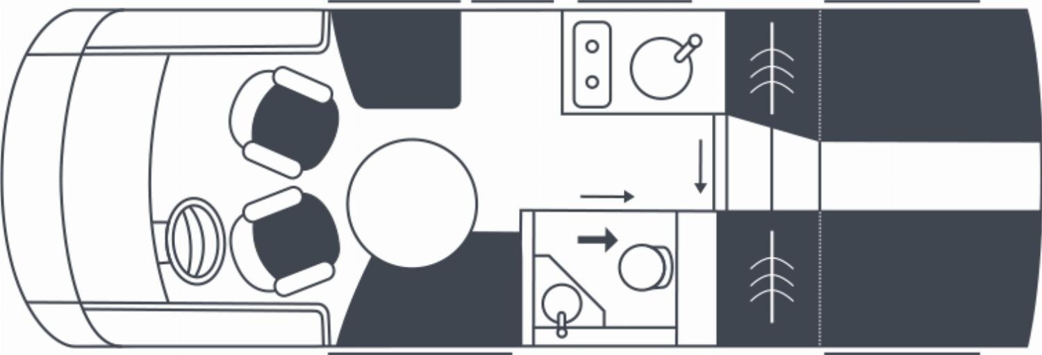 - Sofa Fahrerseite zur L-Sitzbank umbaubar (4 Gurtsitze gesamt), inkl. klappbarer Tischplatte und schiebbarem Tisch dank Bodenschienensystem